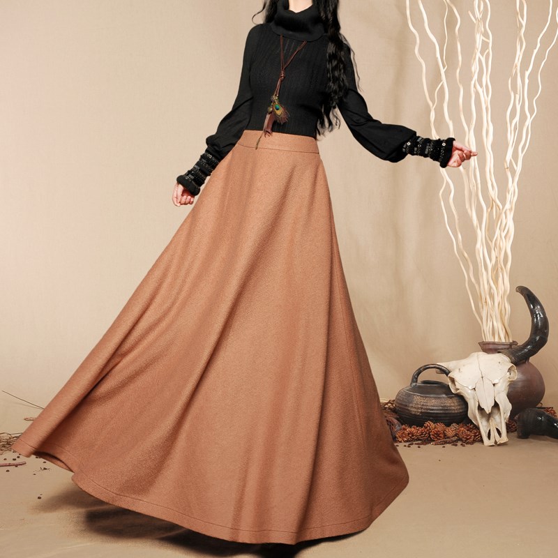 - Длинная зимняя шерстяная юбка. Самым популярным решением остаются изделия из натуральной шерсти. Модельеры предлагают красивые модели в технике вязания, валяние и из готовой прессованной ткани, украшая дизайн интересными принтами и узорами.